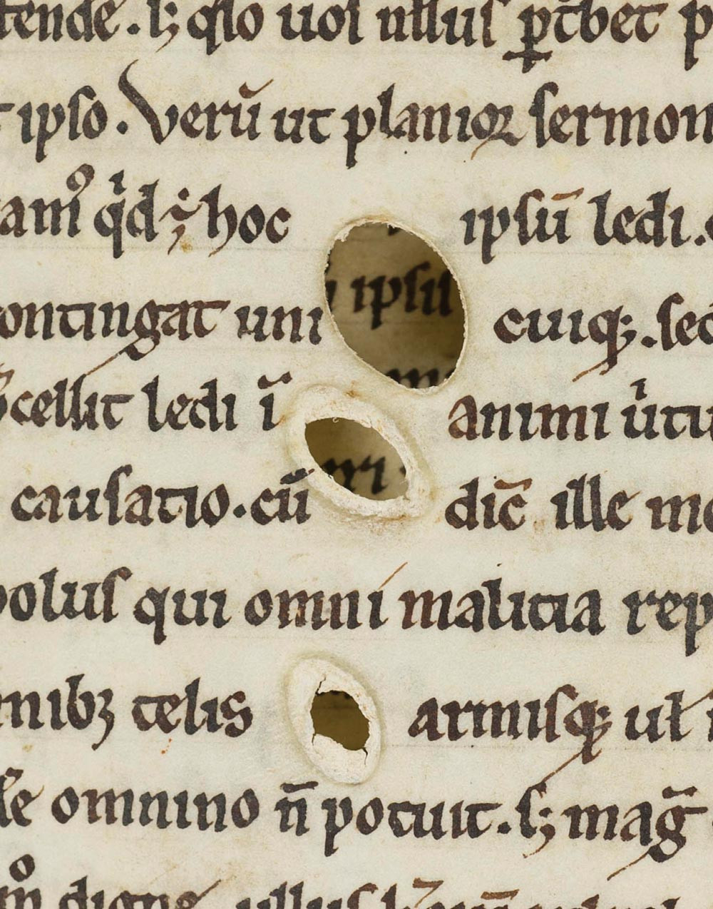 To produce a piece of parchment, the parchment maker placed the skin of an animal (usually a cow or sheep) on a frame, and scraped away the outer layers of hair and skin. During the process, the skin would be tightened on the frame, and a tiny hole in the skin would become much larger as the skin was stretched and re-stretched. Some of these holes would be repaired by sewing them together, and others would be patched, but some were left as is. When looking at a manuscript, it’s usually easy to tell if a hole has been there since the piece of parchment was made. If the hole was there when the scribe was writing the book, he simply wrote around the hole, and evidence of this practice can be seen in many medieval manuscripts.