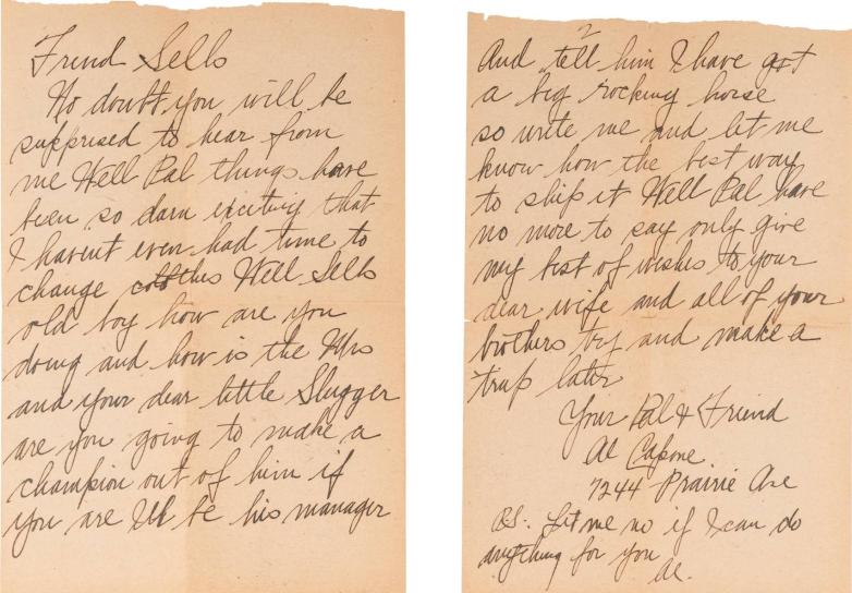 “These letters, written by Capone to his friends, mark some of the most pivotal moments in his time with the Chicago Outfit, discussing the 1925 attempt on his life, bootlegging, and the establishment of Cicero as the gang’s new headquarters just outside of Chicago in 1929,” commented Hindman’s Vice President & Senior Specialist for Books & Manuscripts Gretchen Hause. “We know of no examples of Capone letters to come to market from this prime period of his life, when his influence on organized crime in Chicago was at its apex.”