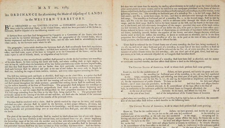 The present Land Ordinance of 1785, printed in New York, is an extremely rare printing of one of the most significant pieces of US congressional legislation; it established America’s public land system, in which the government could parcel out and sell undeveloped land to settlers moving westward. The document was the prelude to the Northwest Ordinance of 1787, the path to future statehood for the territories northwest of the Ohio River, including Illinois, Indiana, Michigan, Ohio, Wisconsin, and the eastern half of Minnesota.