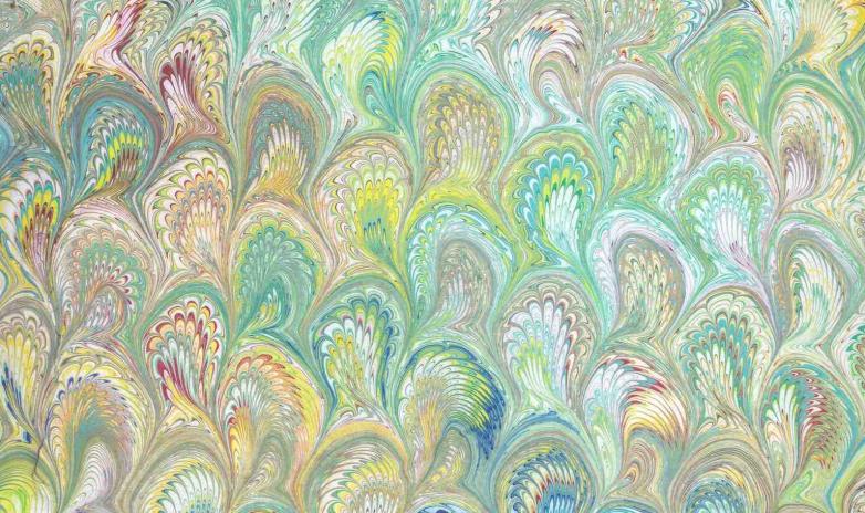 I’d been messing with paper for a few years before I encountered, thanks to a gift my brother gave me, the great handmade paper scholar and crafter Dard Hunter. My sudden obsession with Hunter led me to The Life Work of Dard Hunter, a book compiled by Hunter’s son and grandson (both named Dard), which includes, among many things, the images of the marbled papers Hunter made while studying in Vienna. The more work I do as an amateur marbler, the more respect I have for the shapes Hunter urged from his trays of color. Flower shapes. Lightning strikes. A continuum of wings.