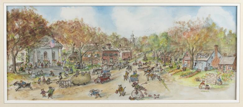 Complete set of 55 original watercolors (one shown here) by beloved children’s author Tasha Tudor for her 1966 book, The Great Corgiville Kidnapping, direct family provenance, est. $60,000-$90,000.
