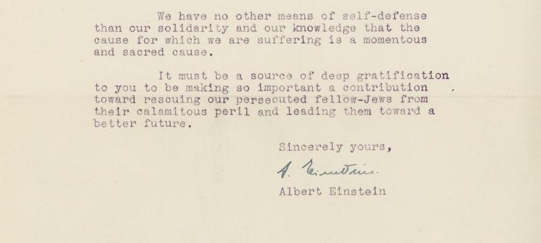 It must be a source of deep gratification to you to be making so important a contribution toward rescuing our persecuted fellow-Jews from their calamitous peril and leading them toward a better future...[signed] A. Einstein.