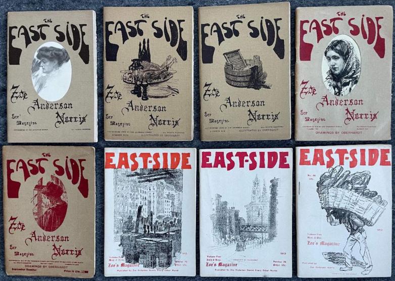 Some of the 29 issues of The East Side, Zoe Anderson Norris’s magazine, 1909-1914.