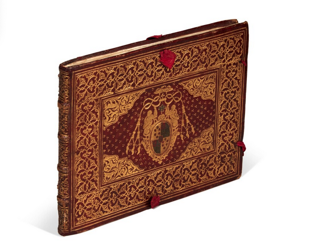 Dedication binding for Cardinal Carlo Borromeo on a copy of Essemplare di più sorti lettere di M. Gio. Francesco Cresci Milanese, scrittore della Libraria Apostolica (1560), offered at Sotheby's this week.