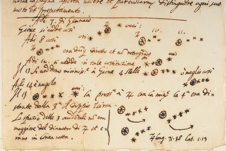 Annotations recording Galileo's discovery of the four moons of Jupiter, from the single leaf manuscript in the University of Michigan Library’s collection once believed to be dated 1610.