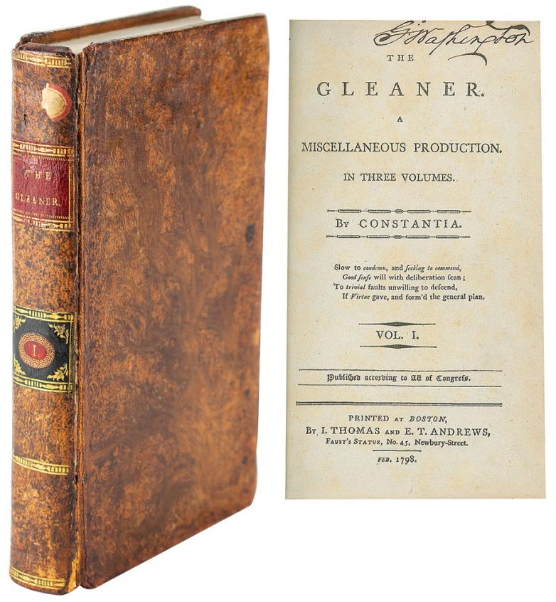 The extraordinary signed book from George Washington's personal library: The Gleaner, Vol. I, by Constantia [Judith Sargent Murray]. First edition. Boston: I. Thomas and E. T. Andrews, 1798. Hardcover bound in contemporary sheep with morocco labels and gilt rules on the spine, 348 pages. Boldly signed on the title page in ink with his ownership signature, "Go: Washington." Loosely laid in are several early 20th-century newspaper clippings covering the disposition of George Washington's personal library upon his death, and later sales of books from it. (Estimate: $80,000+)