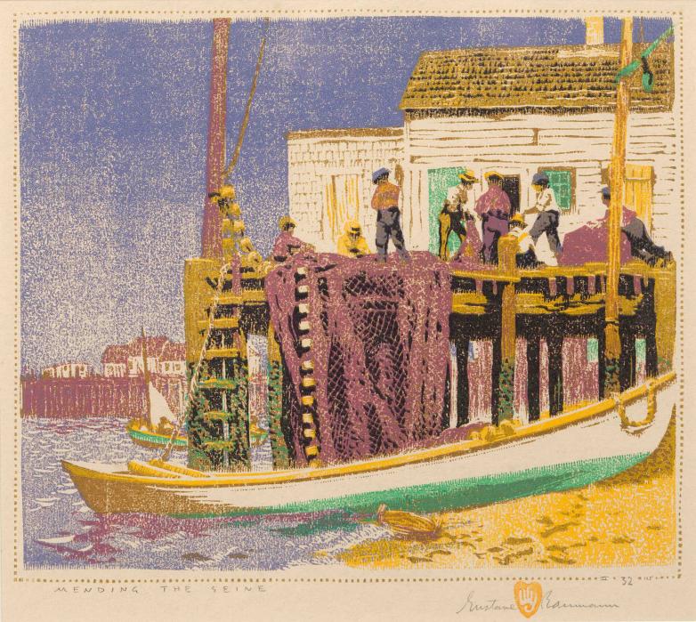 Lot 38, Gustave Baumann, Mending the Seine, 1917, color woodcut