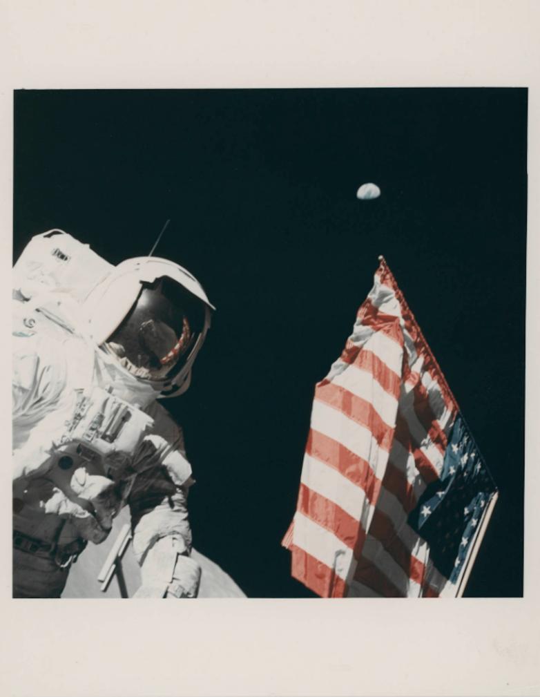 Harrison Schmitt, the Earth and the US flag, Eugene Cernan [Apollo 17], 7-19 December 1972, EVA 1