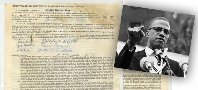 Banking document signed three times by Malcolm X (“Malcolm X Little”), for Muslim Mosque, Inc., two printed pages dated April 2, 1964. Estimate: $18,000-20,000