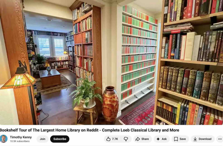 A screengrab from Timothy Kenny's Bookshelf Tour of The Largest Home Library on Reddit - Complete Loeb Classical Library and More video on YouTube