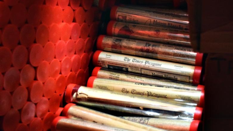 Vintage copies of the New Orleans Times-Picayune, stored in individual tubes.