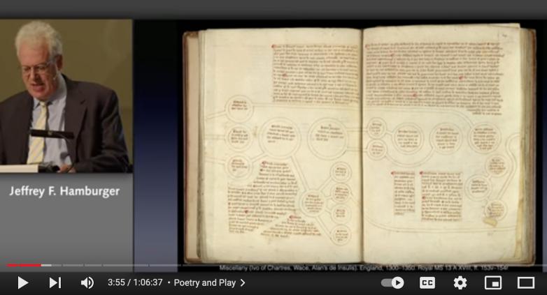 His three lectures on diagrams were titled Drawing Conclusions: Diagrams in Medieval Art and Thought. They included: Maps of the Mind: Diagrams Medieval and Modern; The Codex in the Classroom: Practical Dimensions of Medieval Diagrams; Poetry, Play, Persuasion: The Diagrammatic Imagination in Medieval Art and Thought. Followed by a drinks reception. The streaming and recording of the 2022 lectures was sponsored by New York antiquarian specialist Jonathan A Hill Bookseller.