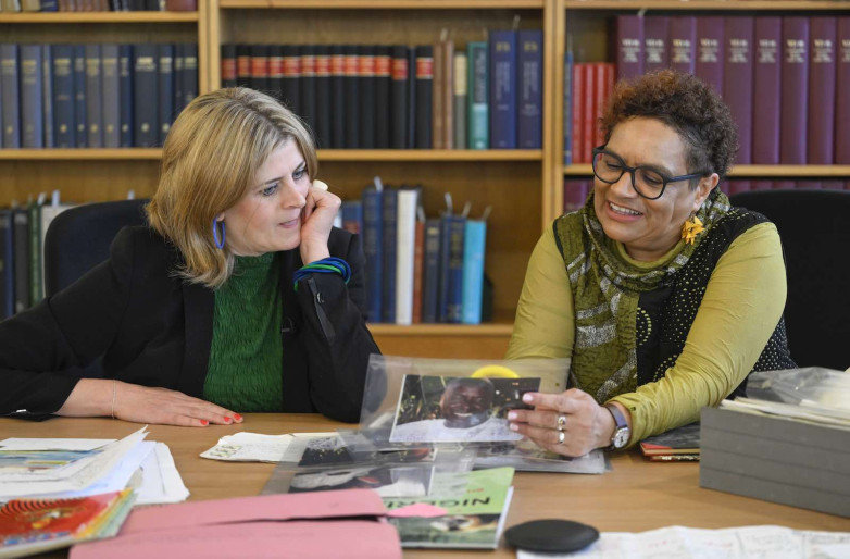 Poet and novelist Jackie Kay at the National Library of Scotland with National Librarian Amina Shah (left)