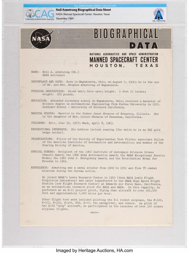The Armstrong Family Collection™ includes NASA documents, such as the last of NASA’s biographical data sheets on the astronaut.