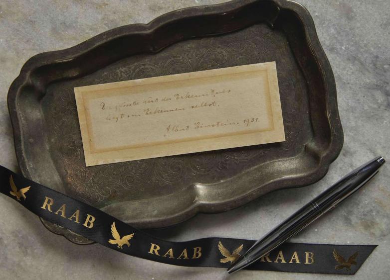 The Raab Collection has discovered and is offering for sale a previously unknown and defining statement in the hand of Albert Einstein in which the world-renowned scientist reveals the real reason to pursue learning and knowledge is for its own sake: “The greatest value of knowledge lies in knowledge itself.”