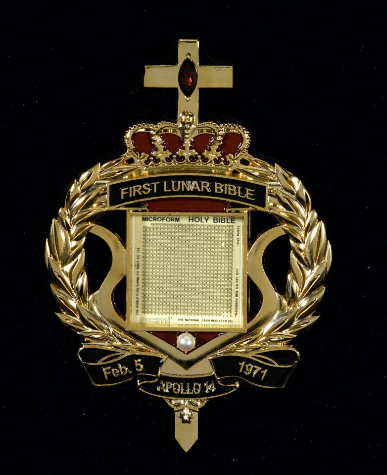 The Lunar Bible, a microtext copy of the Bible carried to the moon by astronaut Edgar Mitchell on Apollo 14 in 1971, offered at Bonhams Los Angeles on Thursday.