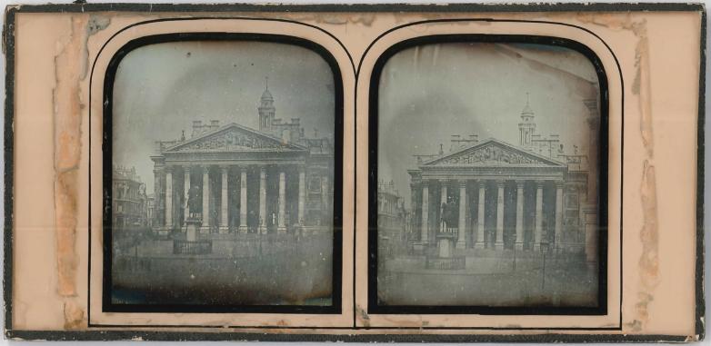 The Royal Exchange in London has twice been destroyed by fire and rebuilt. The present building was designed by Sir William Tite in the 1840's. It was opened by Queen Victoria on 28 October 1844, though trading did not commence until 1 January 1845. Presumably this daguerreotype would have been taken around this time. It is therefore one of the earliest images of this historical building.
