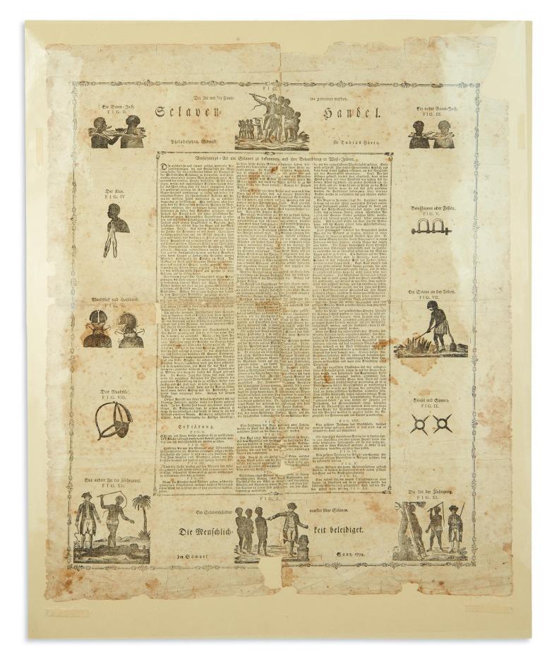 Early German-American anti-slavery broadside, Sclaven-Handel, Philadelphia, 1794. Estimate $12,000-18,000.