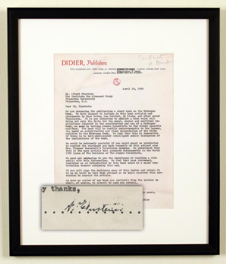 One-page letter typed and signed by Albert Einstein, regarding “the moral, social and political implications inherent in the construction and use of a Hydrogen Bomb,” (est. $9,000-$10,000).