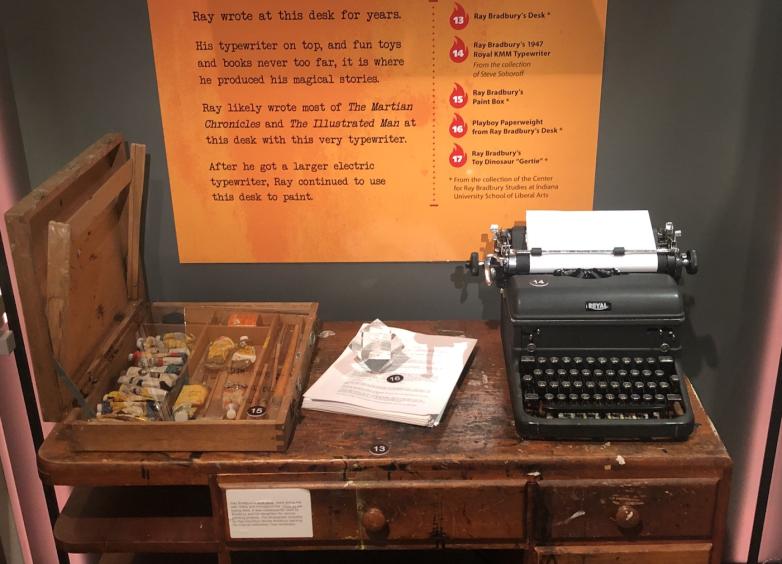 Ray Bradbury artifacts, including his desk, typewriter, and paint box, are on exhibit in Chicago.