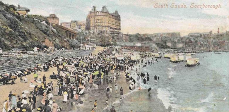 Postcard depicting South Sands at Scarborough, England, in the early 1900s.