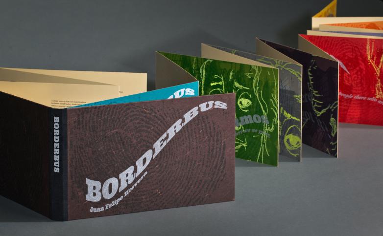 “BORDERBUS,” letterpress and relief printed artists’ book, Felicia Rice, 2019.