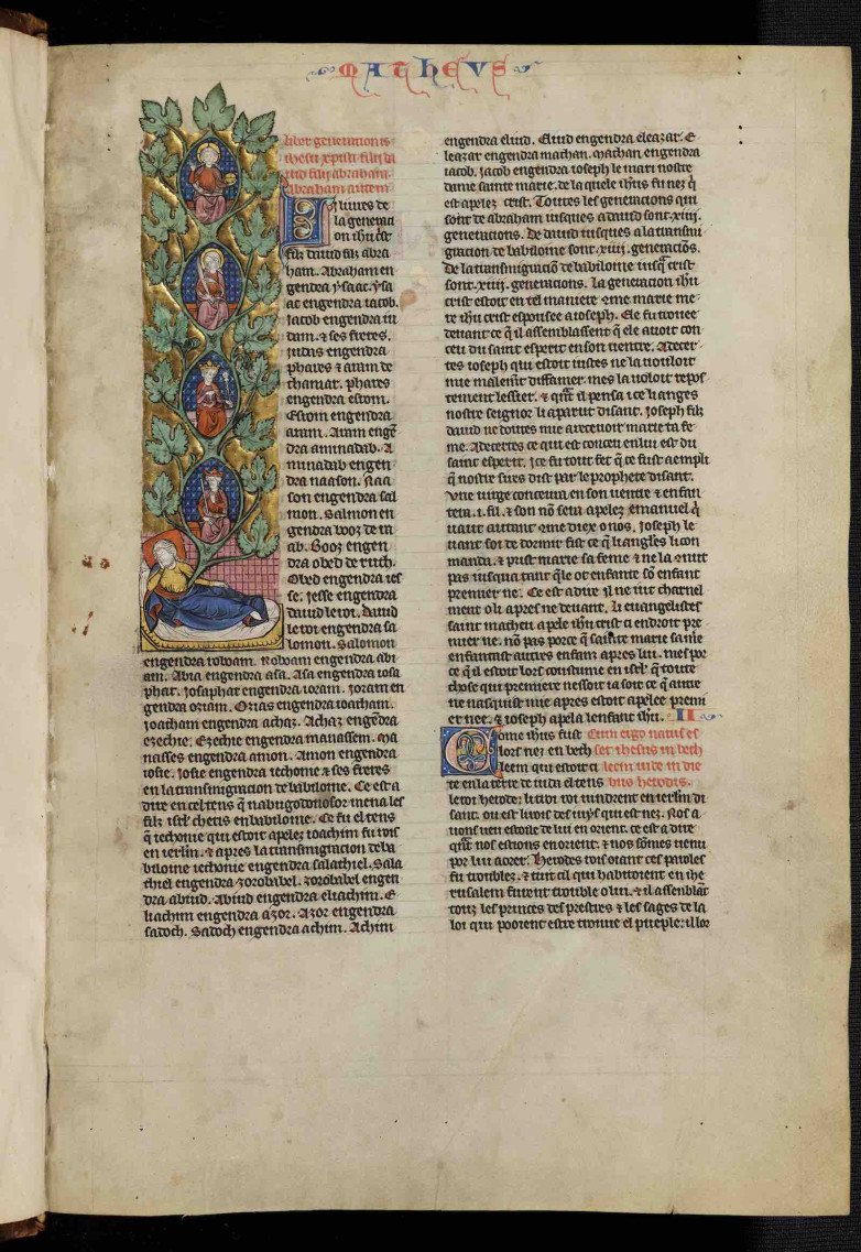 An Old French translation of the New Testament, it has finely decorated initials attributed to the artist known as the Cholet Master. As well as containing the visible autograph of Jean le Bon, who went on to rule as King of France from 1350–1364, ultraviolet light has revealed a series of erased inscriptions showing the manuscript was subsequently owned by three members of the English royal family in the 1400s, Thomas of Lancaster, Edmund Beaufort, and Humfrey, Duke of Gloucester.