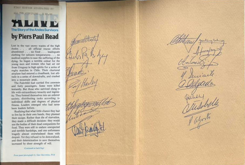 Like everyone else, I was fascinated by the story of the Uruguayan rugby team that crashed in the Andes. At the time the book came out I was working for a bank down the street from the Chinook Bookstore. The store was owned by Richard Noyes and his wife. Mr Noyes was president of the American Booksellers Association at the time, and he was sent a first edition copy of Alive, by Piers Paul Read, signed by all sixteen of the survivors. He displayed it on the counter, and when I came in on my lunch break, I said that’s the book I want. Then they told me it was signed, which sealed the deal. Being retired after 44 years in the book business, I have never seen another copy with all the signatures. —Don Ahlgren
