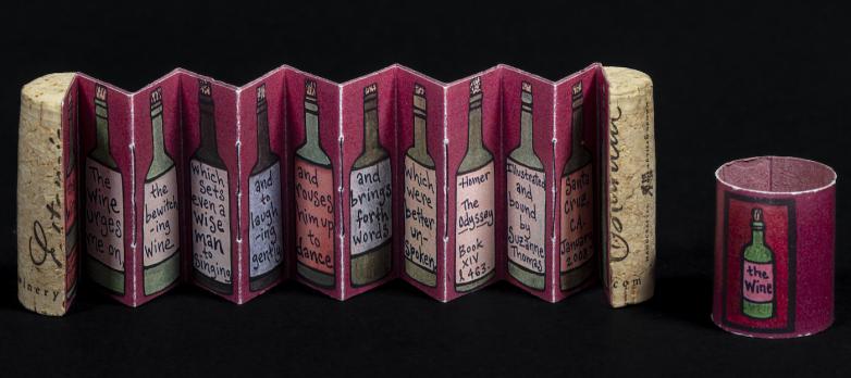 The Wine (2008), a miniature accordion book illustrated and bound by Suzanne Thomas Weinert, is on exhibit at the California Antiquarian Book Fair.