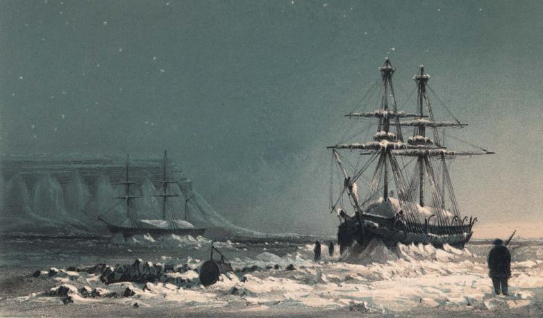 A chromolithograph of William Henry Browne’s “Noon in Midwinter,” from Ten Coloured Views Taken During the Arctic Expedition of Her Majesty’s ships “Enterprise” and “Investigator”(1850).
