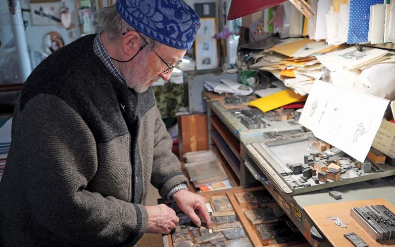 He keeps a collection of woodcut matrices and clichés—printing plates used in letterpress—depicting objects, animals, and fantastic beasts that are reminiscent of a medieval bestiary. He likes to mix this imagery with typeforms and overlap them with different woodcuts during the printing process to create “evocative alchemies.” Sometimes Casiraghy mixes different fonts together, Roman and italics, to create artistic effects.