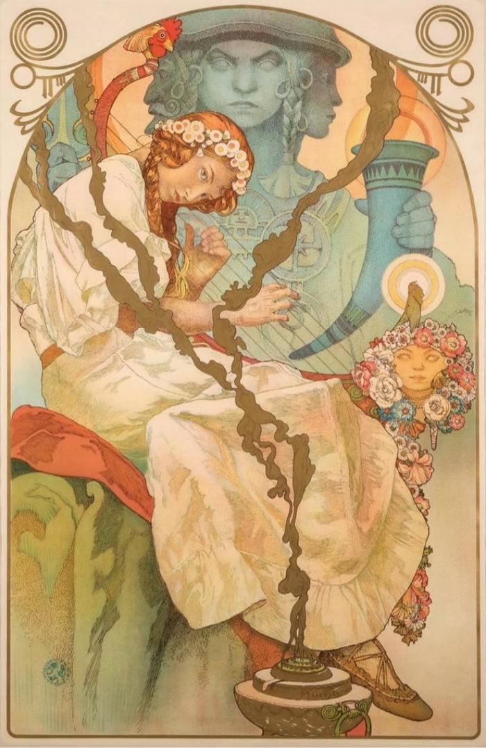 Alphonse Mucha (Czech, 1860-1939), lithograph poster in colors with gold embossing, circa 1928, created for The Slav Epic exhibition of 1930. Estate of Robert Allan Haas. Estimate $8,000-10,000