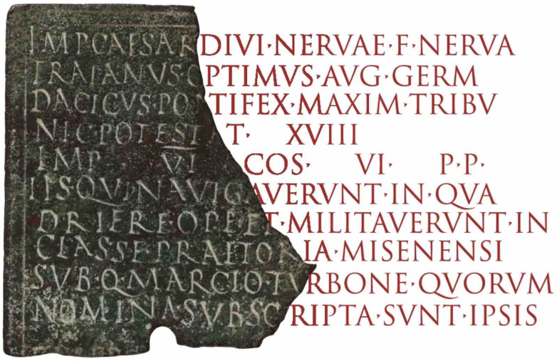Reconstructed fragment of a bronze military diploma from Sardinia, issued by the emperor Trajan to a sailor on a warship. 113/14 CE