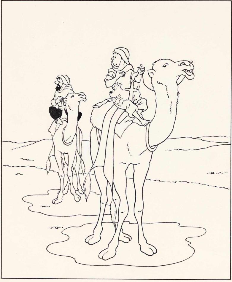 The cover for 1961's Album à colorier No. 5 is a modified rendering of the cover to the 1941 story The Crab with the Golden Claws, among the volumes Steven Spielberg used as inspiration for his 2011 film The Adventures of Tintin. Hergé took the original image featuring Tintin and Captain Haddock and erased a few things — shards of glass from an exploding bottle, bandits just over the dune, the camels' shadows — to make it easier for children to color the work.